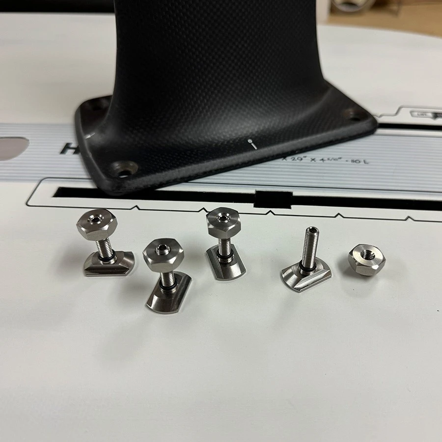 This Universal Easy Track hardware set will work on almost any brand hydrofoil. The reversable cone nuts allow mounting of a “flat” style mast plate or a mast plate with counter sunk screw holes.